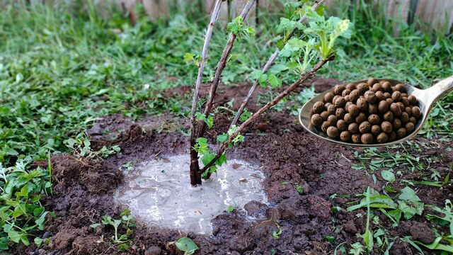 Рассыпайте гранулы по кругу вокруг ствола, отступив 40-50 см. Достаточно по 3 столовые ложки под куст. Слегка заделайте в почву и полейте.