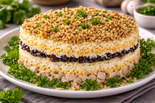 Собираю салат слоями на плоском блюде или в салатнике. Первым слоем выкладываю куриное филе и слегка смазываю майонезом. Далее распределяю морковь, затем чернослив, кусочки грейпфрута и снова добавляю немного майонеза. Завершающим слоем посыпаю салат измельчёнными грецкими орехами. По желанию слои можно повторить или просто аккуратно перемешать все ингредиенты.